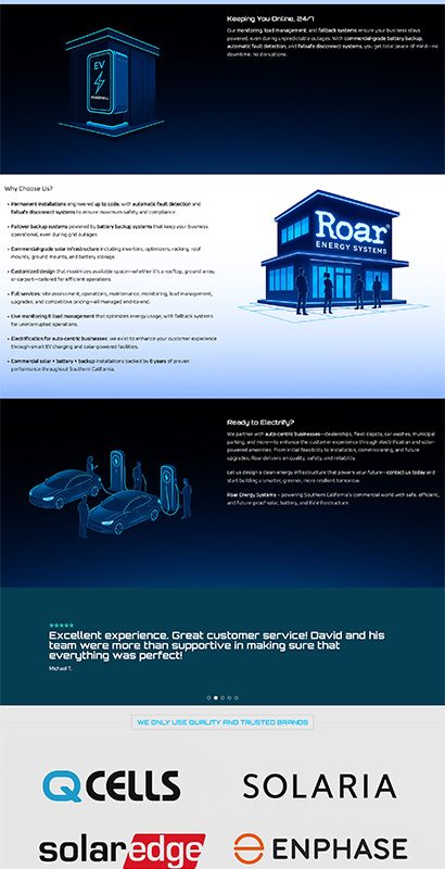 RoarEnergySystems.com is the digital hub for Roar Energy Systems, a commercial clean-energy solutions provider that helps businesses electrify and modernize their properties with EV charging infrastructure, solar carports, and battery energy storage systems. The company designs and installs turnkey, scalable systems — from Level 2 and DC fast EV chargers to solar-powered canopies and integrated […]