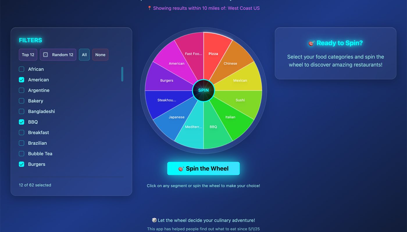 SpinForDinner.com is your go-to meal decision engine that turns the age-old “What’s for dinner?” debate into a playful spin of the wheel. Simply choose your food categories or meal options, hit spin, and let fate (and a colorful virtual wheel) point you toward your next dinner idea — whether it’s tacos, pizza, sushi, barbeque, or […]
