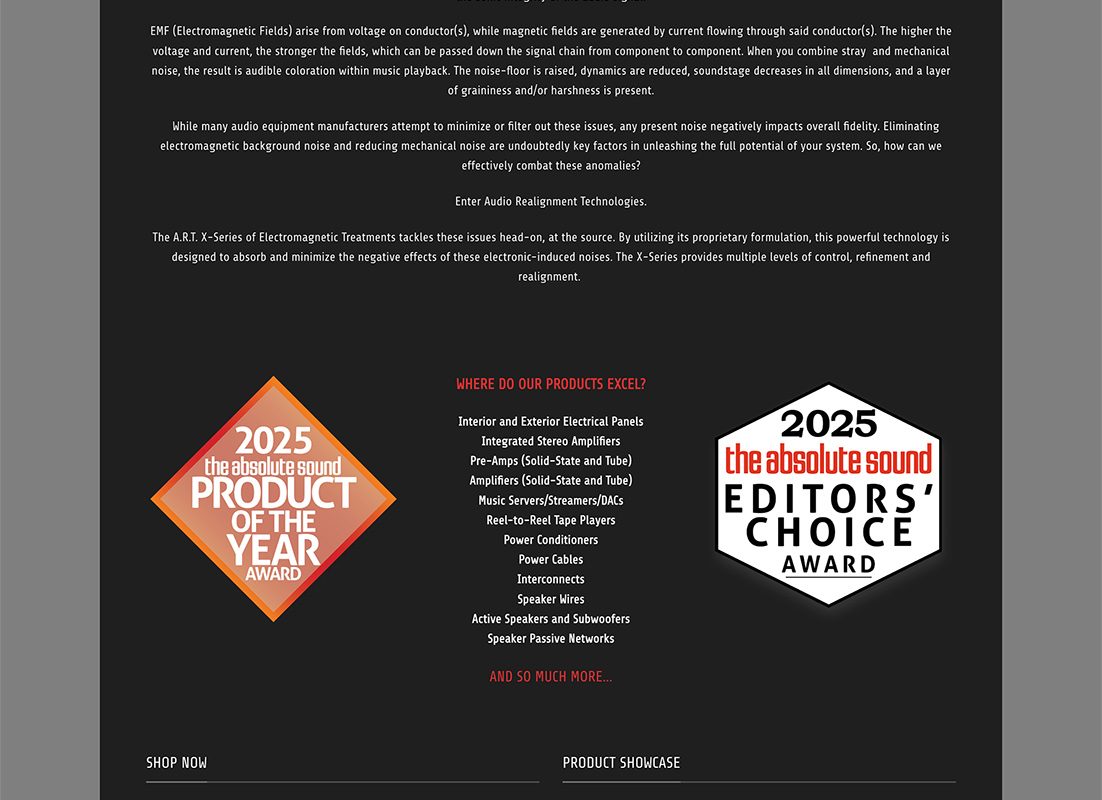 Audio Realignment Technologies (A.R.T.) specializes in electromagnetic treatment devices designed to enhance the performance of audio systems by reducing electromagnetic interference (EMI) and radio frequency interference (RFI). Their proprietary technology aims to improve clarity, dynamics, and overall sound quality.