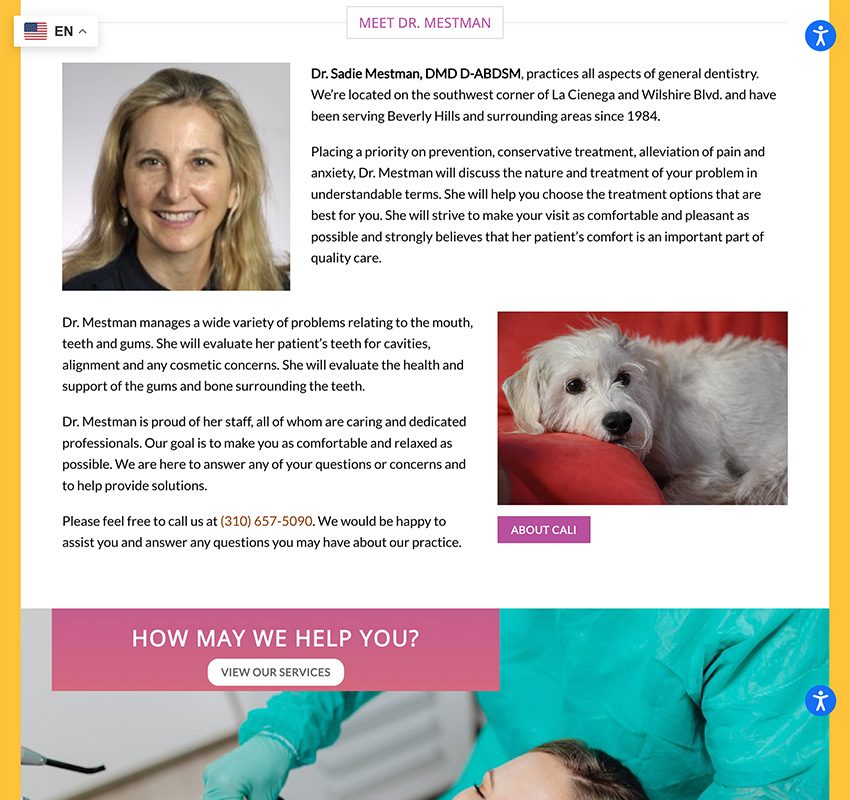 Dr. Sadie Mestman is a seasoned general dentist practicing in Beverly Hills, California, since 1984. Located at 8500 Wilshire Blvd, Suite 827, her clinic offers a comprehensive range of dental services, emphasizing prevention, conservative treatment, and patient comfort.